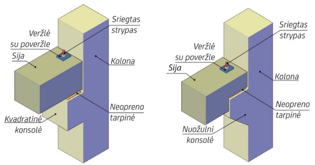 Ant konsolės dažniausiai remiamos sijos. Jos užfiksuojamos naudojant konsolėje iškištą vartą. Tarp sijos ir konsolės dažniausiai numatoma neopreno tarpinė, kuri tolygiai paskirsto sijos perduodamą apkrovą (5 pav.).