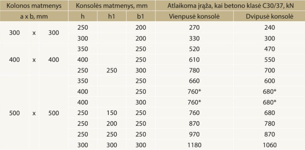 1 lentelė. Standartizuotų matmenų konsolių lankančiosios galios.