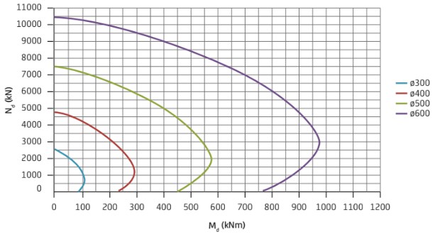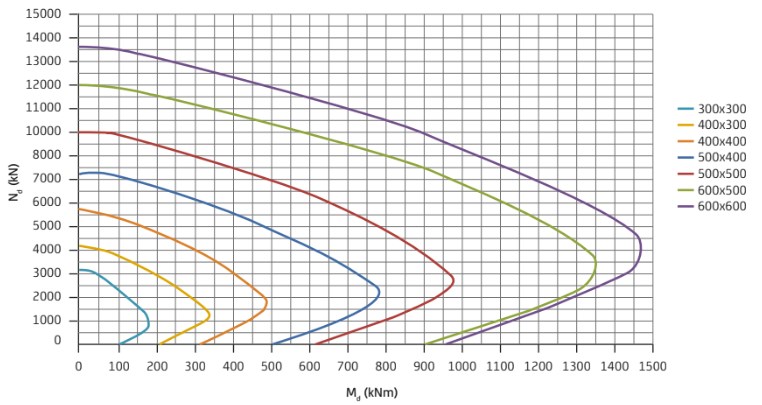Grafikuose pateiktos 4m aukščio kolonų darbinių charakteristikų kreivės, priklausomai nuo ašinės apkrovos ir lenkimo momento dydžių. Skaičiuota stačiakampio skerspjūvio kolonoms nuo 300x300 mm iki 600x600 mm ir apvalaus skerspjūvio kolonoms nuo 300 mm iki 600 mm. Dėl tikslesnių laikančiųjų galių kreiptis į UAB Betonika projektavimo skyrių.