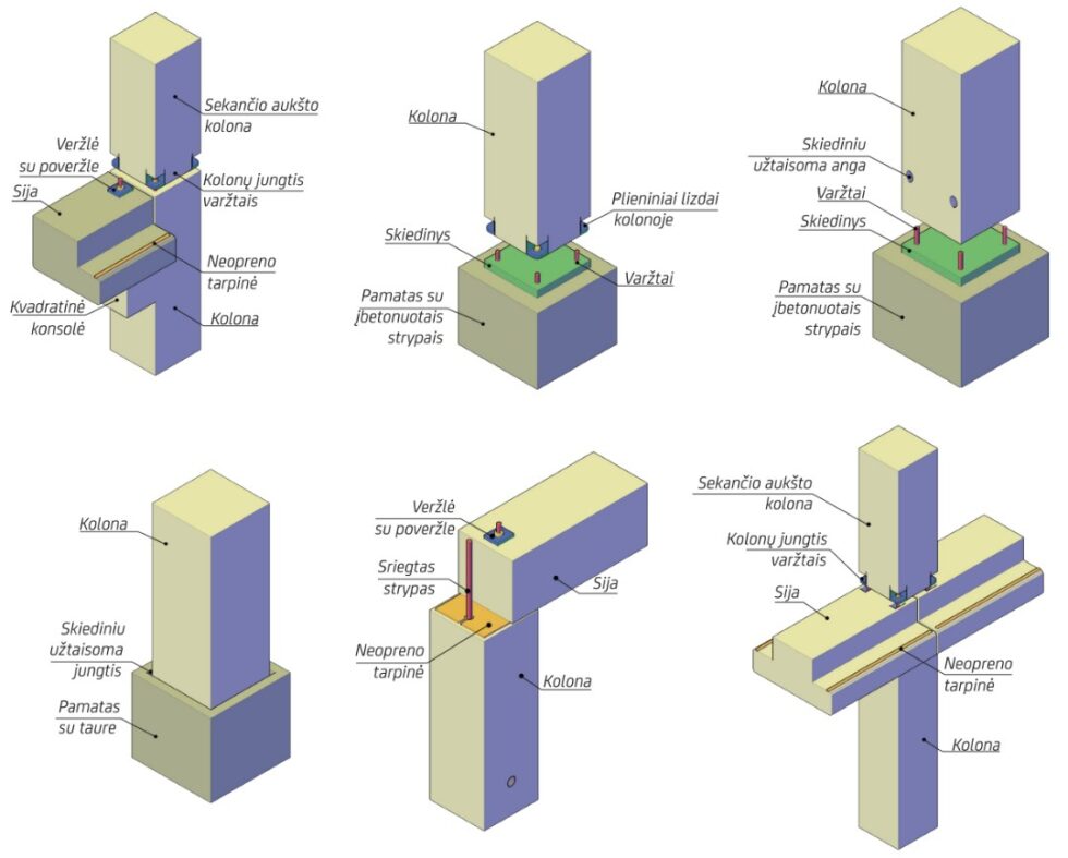 Tarpusavyje kolonos tvirtinamos varžtais arba naudojant nenutraukiamąjį armavimą jungties mazge.